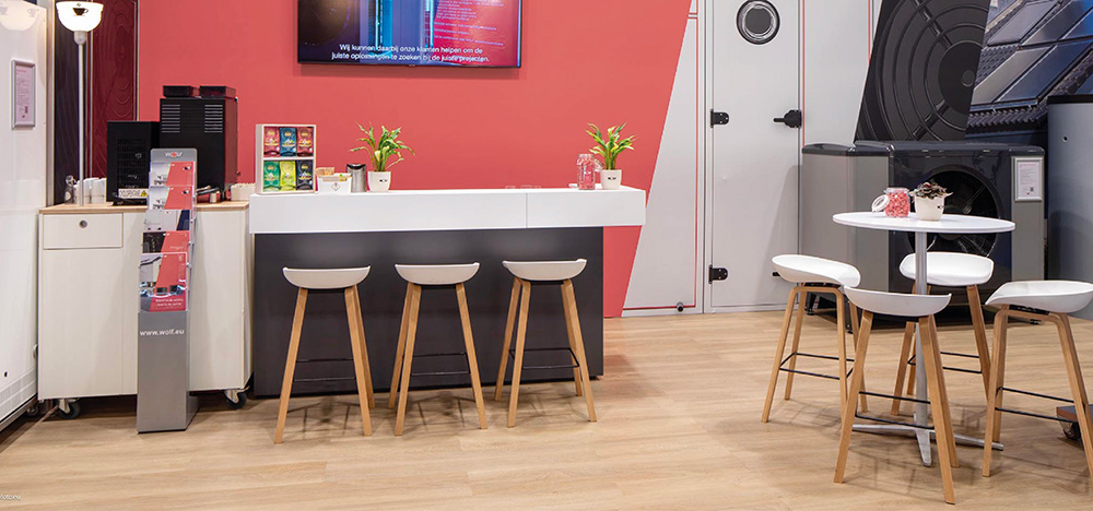 The floor of an exhibition stand has a major impact on the overall appearance. NordicFloor offers you the opportunity to create a warm atmosphere with various shades of wood look . The lifelike motifs and textures of the Loose Lay PVC elements help you quickly create a warm look at your stand or other location. You can also choose a trendy, modern look with the contemporary concrete look.