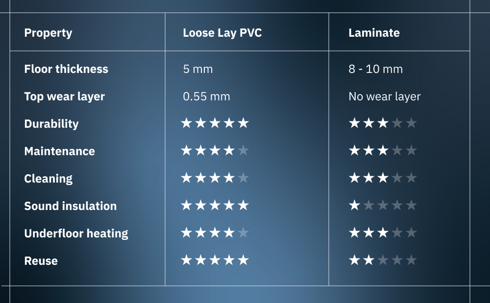 Save time and money with NordicFloor Loose Lay, as the weight and rubber anti-slip structure on the backing keep the floor elements firmly in place. Laying the floor elements and dismantling them is a simple task. Where other systems leave adhesive residues and damage, the subfloor under the Loose Lay PVC remains as clean and tidy as it was when installed.