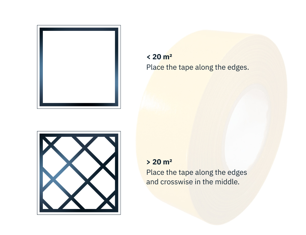 To fix Loose Lay in an exhibition stand over 20 m², it is recommended to use double-sided carpet tape on the subfloor according to the guidelines below: